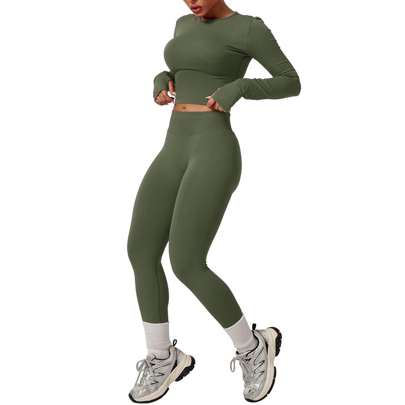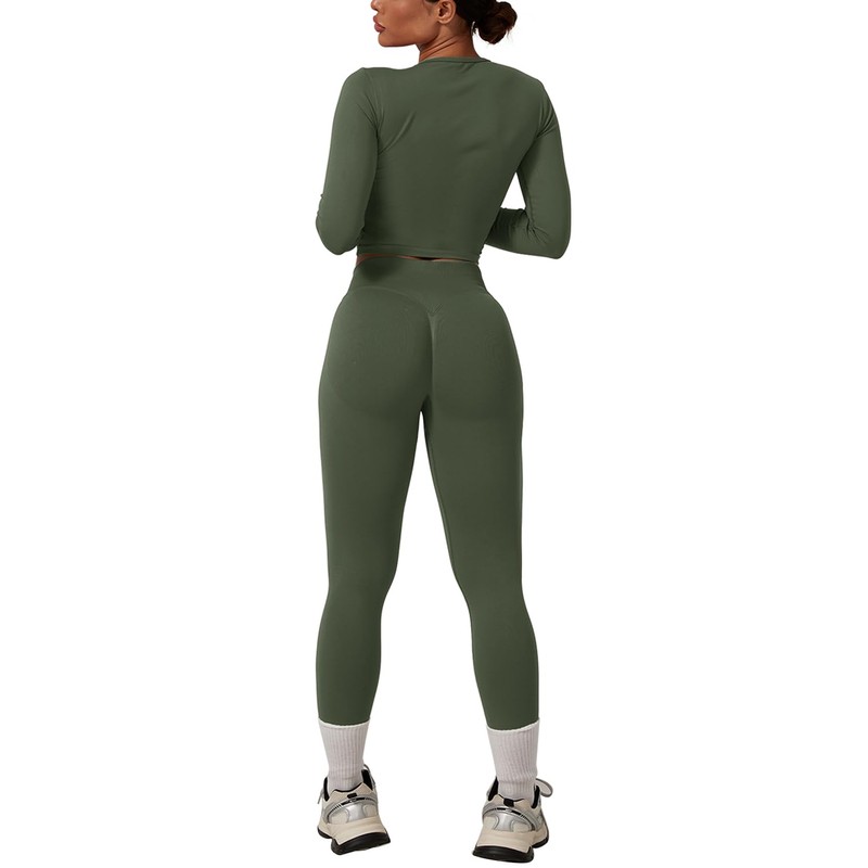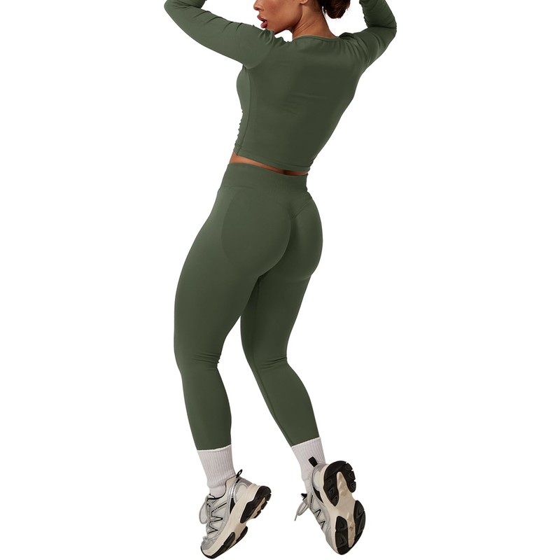 Workout Sets for Women 2 Piece Seamless Long Sleeve Top Hidden Scrunch Leggings Gym Outfits