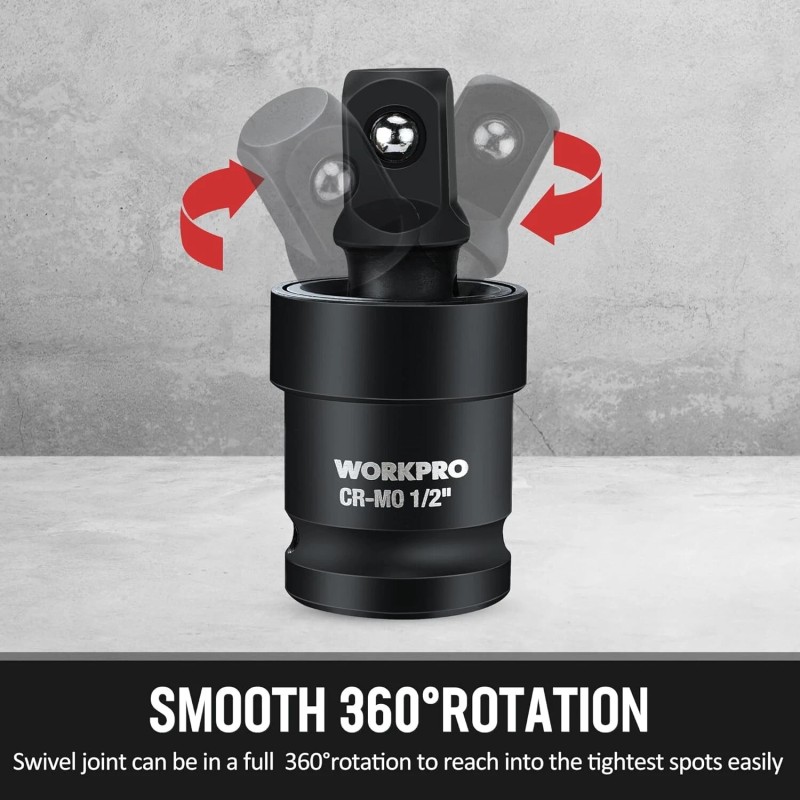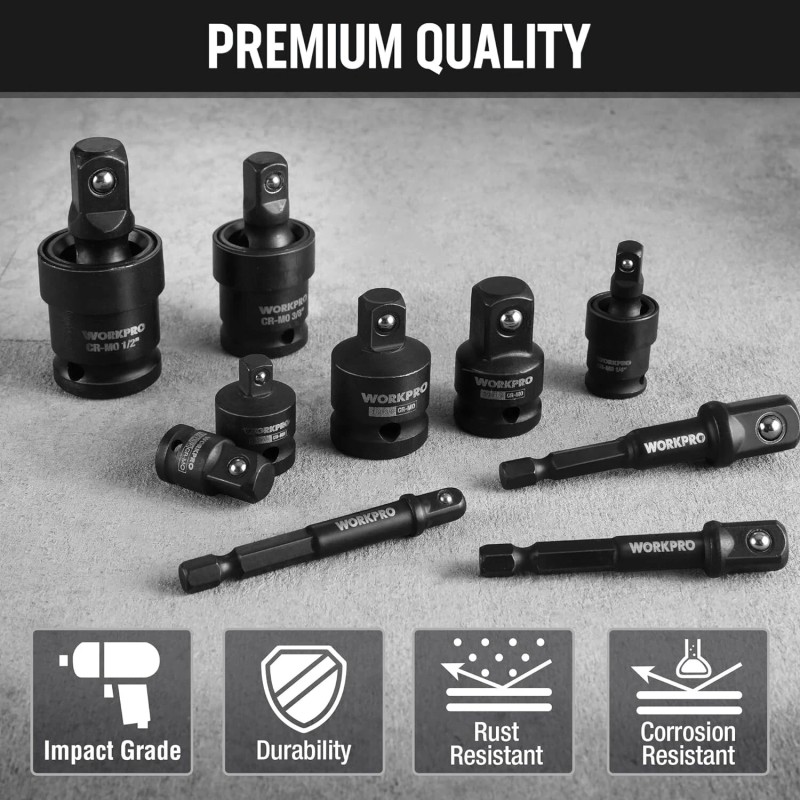 - Set Includes: Workpro impact socket adapter set includes 4 pcs reducers: 1/4"F to 3/8"M, 3/8"F to 1/4"M, 3/8"F to 1/2"M, 1/2"F to 3/8"M, 3pc impact universal joint socket: 1/4", 3/8", 1/2" , 3pc 1/4" dirve drill adapter: 1/4", 3/8", 1/2".