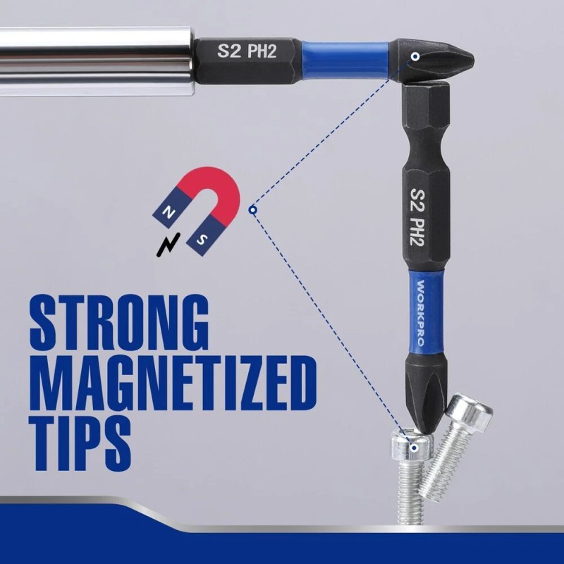 WORKPRO 12pcs PH2 Impact Phillips Screwdriver Bit Set, CNC Machined S2 Steel Tips with Magnetism, 1/4" Hex-Shank Driver Bits, 2" Long Impact Screwdriving Bits with Storage Box