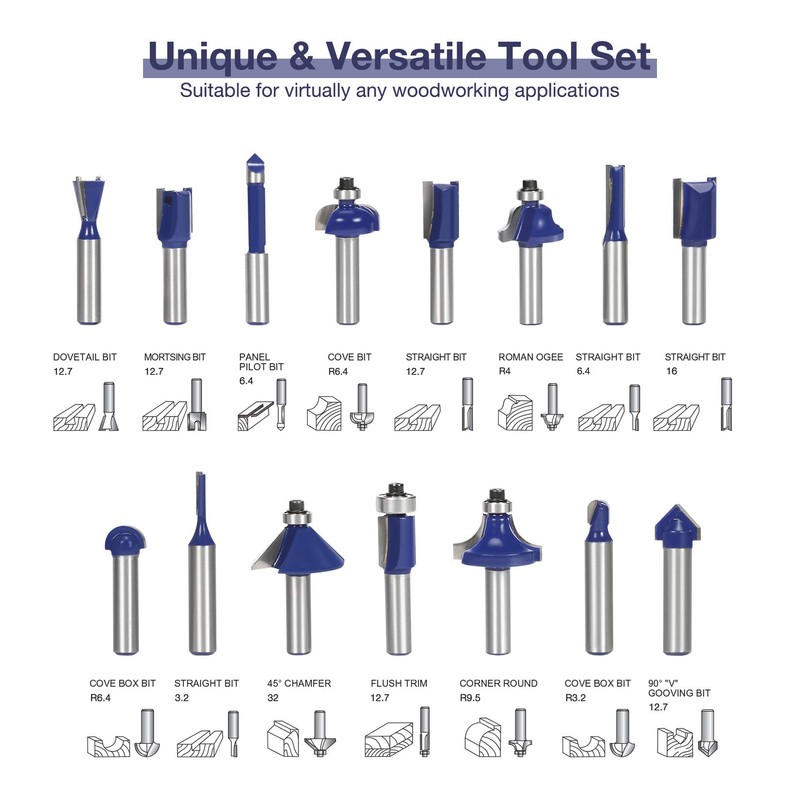 - Compatible: The WORKPRO 15-piece Milling cutter set is suitable for routers with 8 mm tool holder of all power tool brands