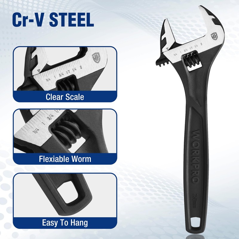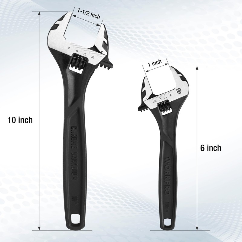 WORKPRO 2-piece Adjustable Wrench Set, 6-Inch & 10-Inch Wrenches, Cr-V Steel, Wide Jaw Wrench with Metric & SAE Scale, good for Home, Garage, Workshop