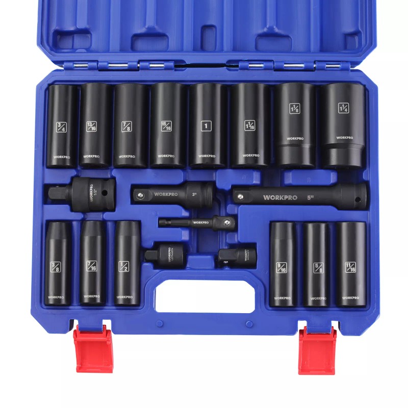- Deep Impact Socket Set: The package includes 14PC 1/2" Deep Impact Socket Set, SAE: 3/8"、7/16", 1/2", 9/16", 5/8", 11/16", 3/4", 13/16", 7/8", 15/16", 1", 1-1/16", 1-1/8", 1-1/4"; 1pc 1/2"Extension Bar(3");1pc 1/2"Extension Bar(5"); 1pc1/2" Swivel Adapter; 1pc1/2" Hexagon Extension Bars; 1pc 3/8"(F) to 1/2"(M) Socket Adapter; 1pc 1/2"(F) to 3/8"(M) Socket Adapter.