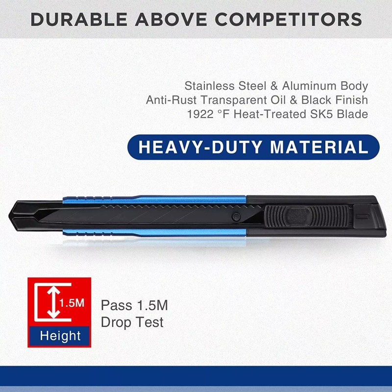 - 【Heavy-Duty & Lightweight Utility Knife】 Aluminum alloy and stainless steel design with rust-free powder-coat makes the box cutter durable and lightweight (0.7 oz), passing the 1.5m drop test. SK5 razor blades through 1922 °F heat treatment are up to 64 HRC. For long-lasting, extremely durable cuts and slices on boxes, plastic packaging, and straps.