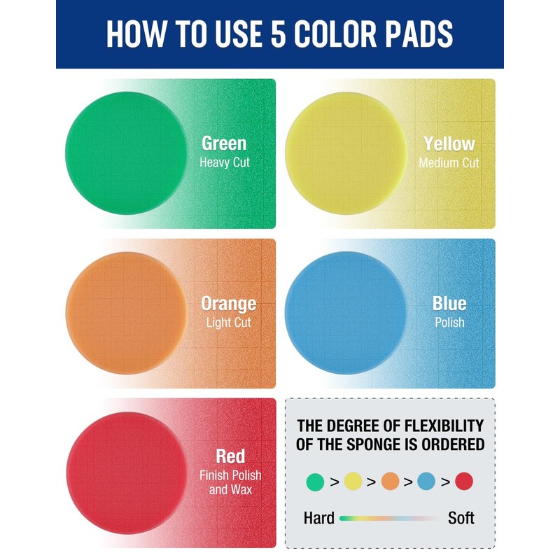 - Compounding & Polishing & Waxing: These sponge pads, available in five colors, are ideal for various tasks: Green for heavy compounding, Yellow for medium polishing, Orange for light polishing, and Blue and Red for final polishing and waxing. They effectively remove sun damage, car scratches, and headlight wear. Green tackles oxidation coatings and mild scratches, Yellow handles sun damage and swirl marks, Blue polishes, and Red finishes with waxing