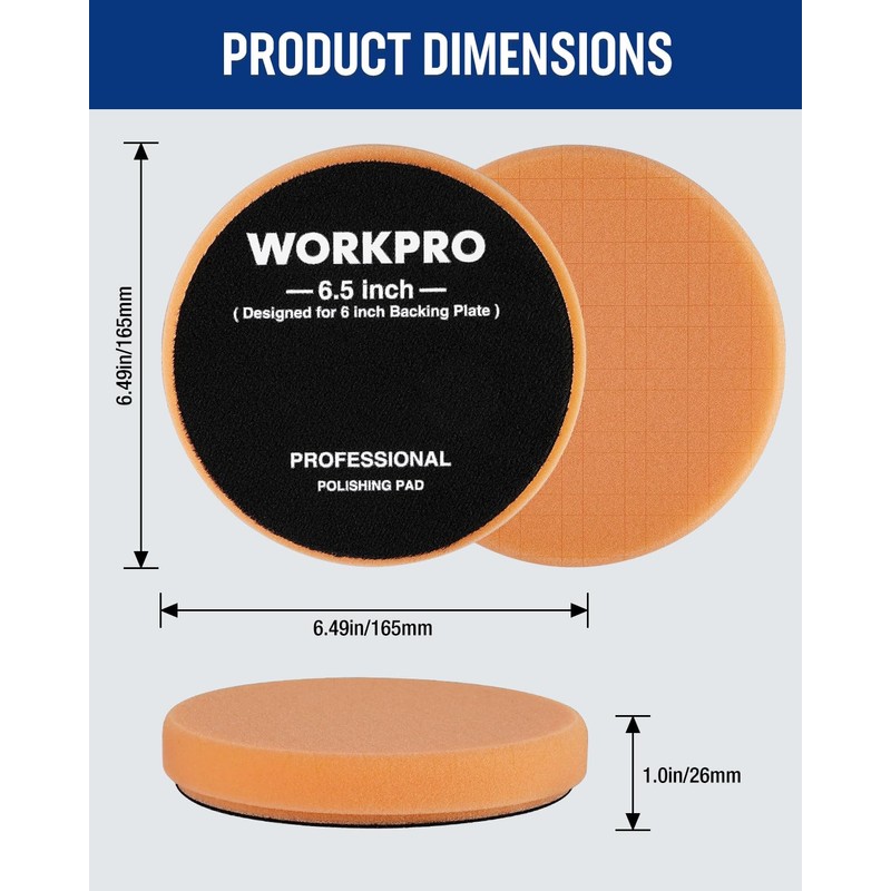 - Product Dimensions: The WORKPRO buffing polishing pads have a diameter of 6.49 inches/165mm and a thickness of 1 inch/26mm, suitable for a 6-inch backing plate. They are professional polishing pads