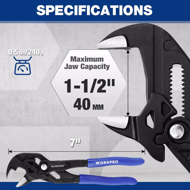 Quick Adjustment Mechanism: The WORKPRO pliers wrench features a quick-adjustment mechanism that lets you easily and rapidly set the wrench’s jaw to the desired width. With a maximum opening of 1-1/2" (40mm), the tool accommodates a wide variety of fasteners. The adjustment button and groove design ensure precise, fast, and hassle-free adjustment, allowing you to work efficiently