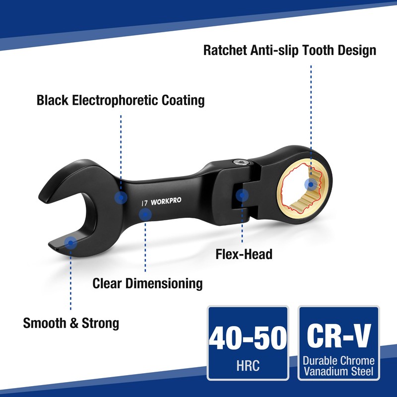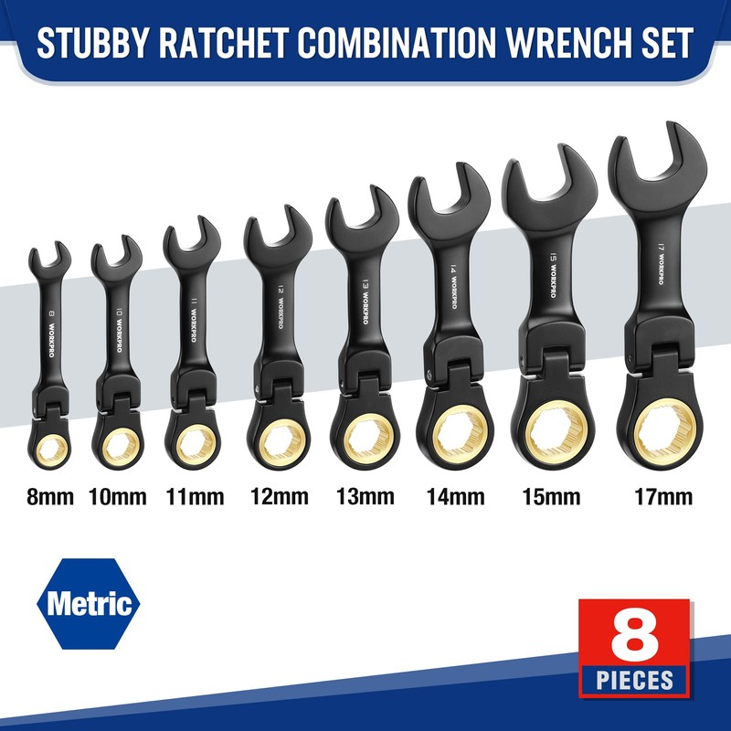 WORKPRO 8-Piece Stubby Anti-slip Ratcheting Combination Wrench Set, Metric 8-17 mm, 72-Teeth, CRV, Black Electrophoretic Coating, Flex-Head Wrench Set with Rolling Pouch