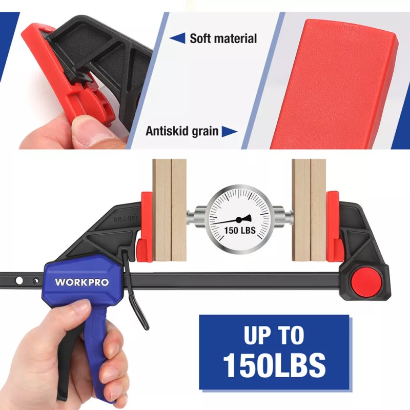 Powerful Clamping Force - With up to 150 lbs of squeezing force and a metal ratcheting mechanism, WORKPRO bar clamp offers a decent choice for woodworking or other household repairs. Its lightweight, yet sturdy, and is capable of holding pressure for extended periods.
