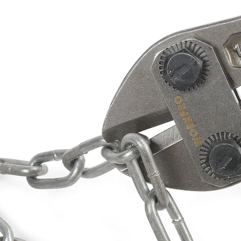 This WORKPRO bolt Cutter is featured with molybdenum steel jaws, compound cutting action requires less effort. Bi-material soft handle for comfortable cutting.