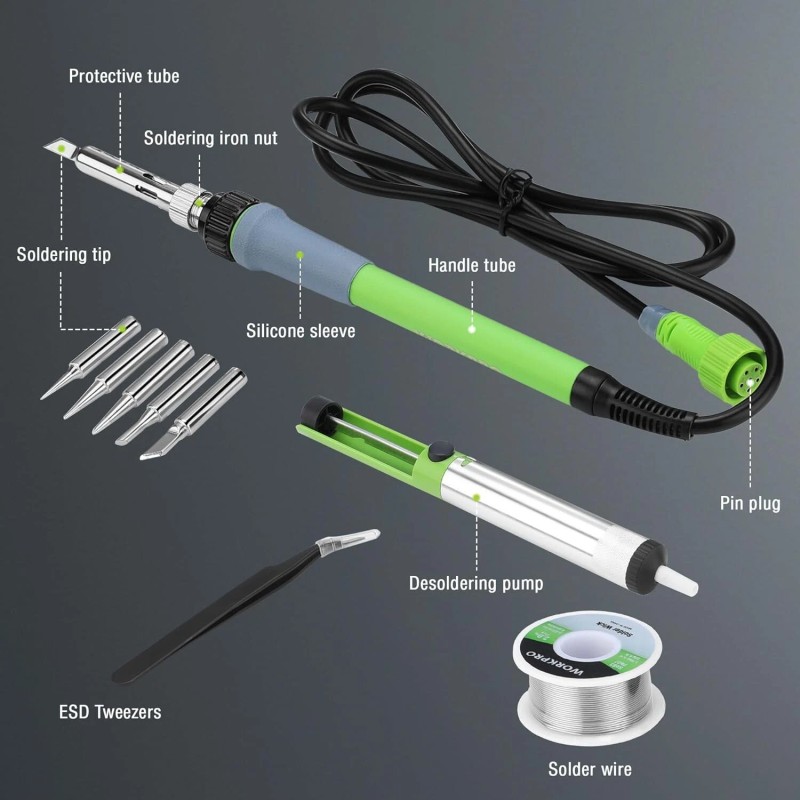 - CLASSIC ALL-ROUND SOLDERING KIT: The most useful and necessary tools for soldering, including soldering iron, safety holder, cleaning sponge, 5pcs extra interchangeable solder tips, ESD tweezers, tip cleaner, solder wire, solder paste and solder sucker.