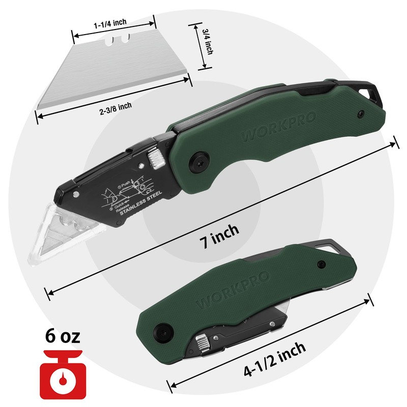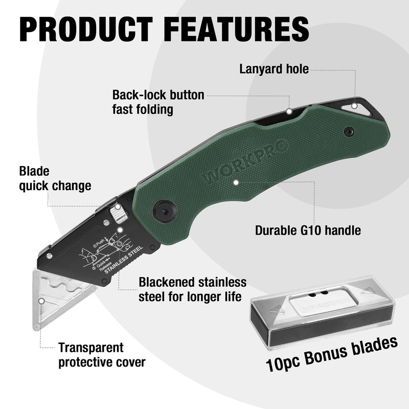 WORKPRO Folding Utility Knife G10 Handle with Stainless Steel Head, Quick-change Blade & Back Lock, Heavy Duty Box Cutter, 1PC Razor Knife with Extra 10PC SK5 Blades