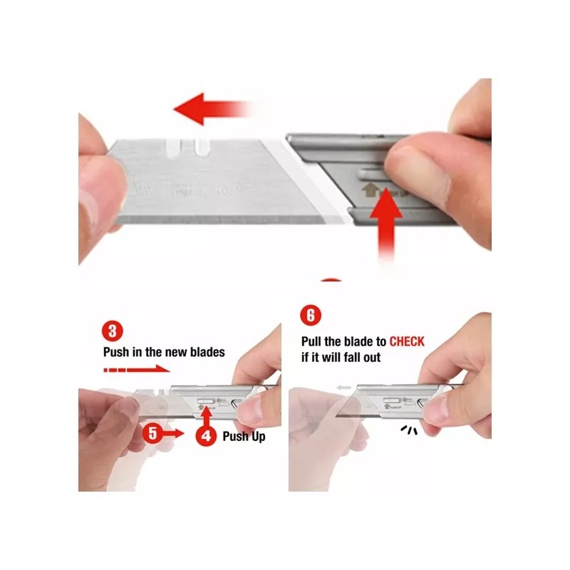 Quick Blade Change Mechanism: Pull out the blade with the push-up of a button and easily replace the new sharp blade with your hand, no need for a screwdriver or any other tools for disassembling. One more big plus is that it can accommodate all standard or pro-grade utility knife blades.