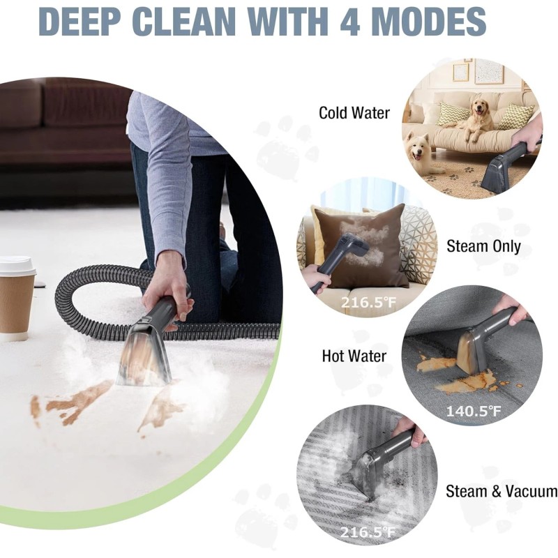 - Four Versatile Cleaning Modes: This portable carpet cleaner is designed with four powerful modes to meet your various cleaning needs. Cold water mode is perfect for everyday cleaning, hot water mode tackles more stubborn stains, the steam only mode penetrates deeply to sanitize and refresh surfaces, and the steam & vacuum mode for deep steam cleaning while sucking up dirty water
