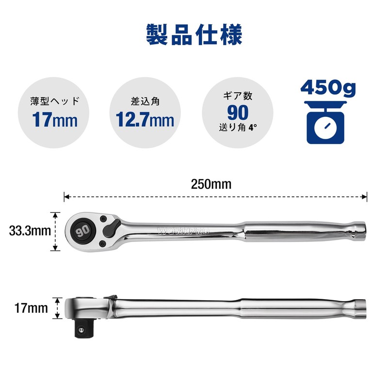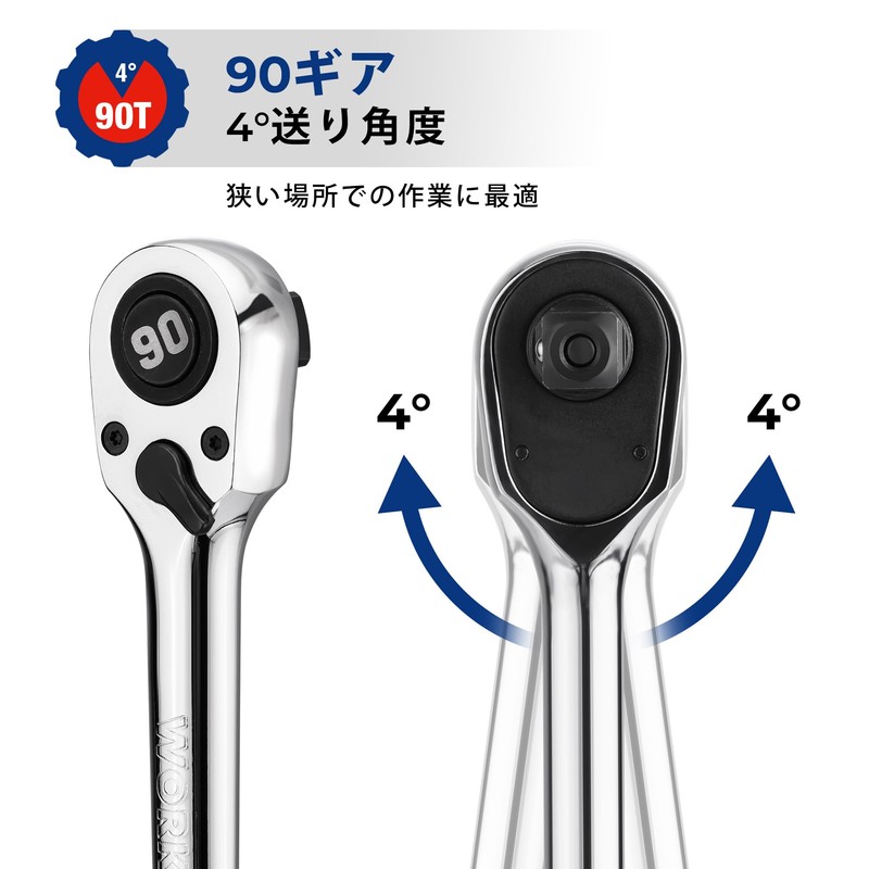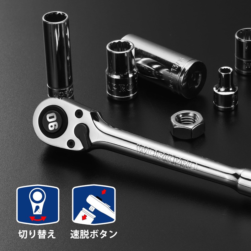 WORKPRO Ratchet Handle, Ratchet Wrench, Socket Wrench, Insertion Angle 0.5 inch (12.7 mm), Thin, 90 Thread Gear, Easy Switch Rotation Direction, Quick Release Button, Compact, Tightening Bolts, Nuts