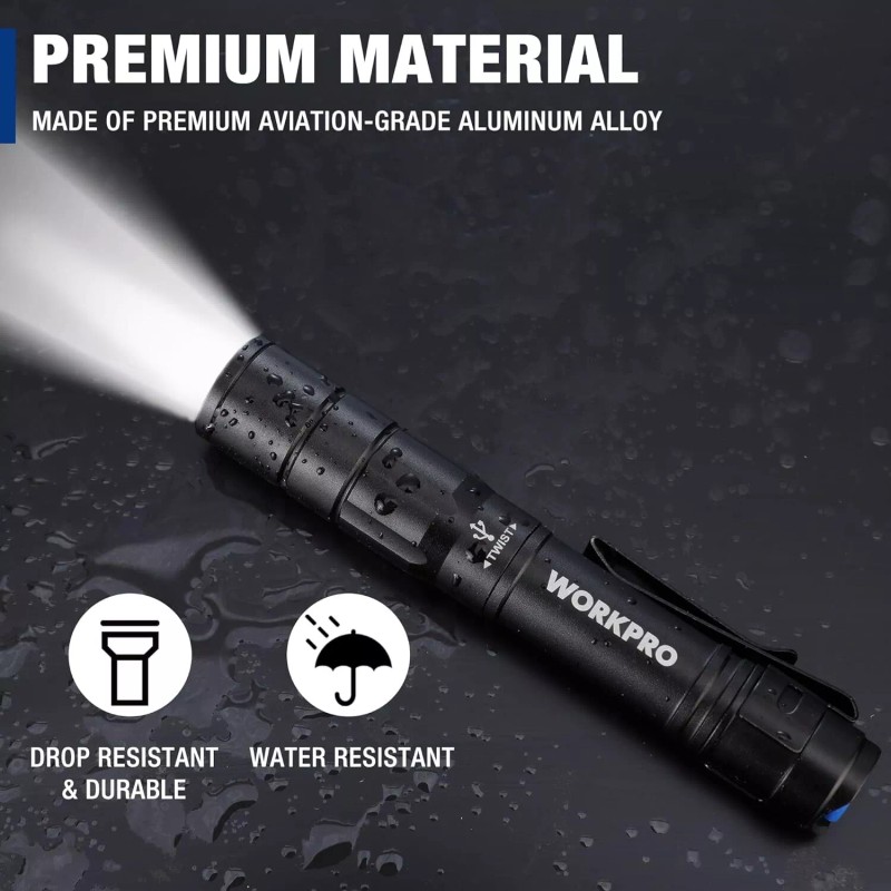 Small Yet Mighty - The WORKPRO Mini flashlight features the highly recommended T8 Osram LED, which deliver an incredible 300 lumens and a beam distance of up to 196 feet. With its ultra compact design, measuring just 4-1/3inch in length and weighing only 1.76oz, the small flashlight takes up barely any space in the pocket.
