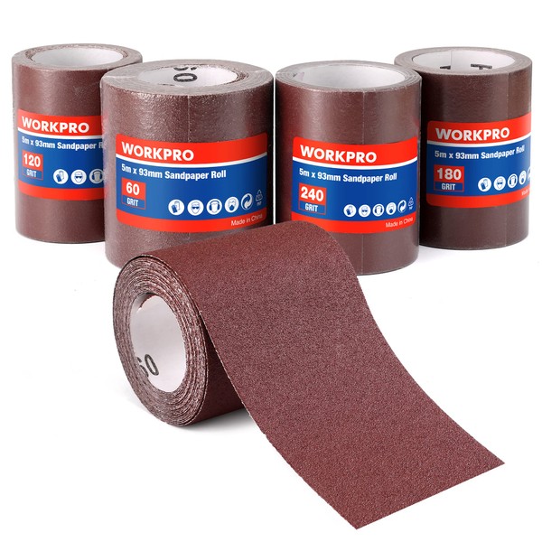 WORKPRO Sandpaper Roll Set 4 Rolls, 9.3cm x 5m, 60/120/180/240 Grit, Aluminium Oxide Abrasive Sanding Paper for Sanding, Polishing and Rust Removal