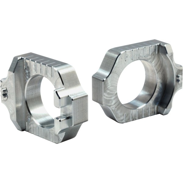 Works Connection 17-325 Elite Axle Blocks Silver Consisting of a pair of CNC’d Elite axle blocks, a titanium drive-side receiver and a square removal tool nut, the Elite Axle Block Kit converts your stock Off-Road or Dual Sport model’s rear axle from a fixed design into a floating type. Factory teams use this same floating type design on their race team bikes to improve traction as well as straight line stability and now those same benefits are available from this kit. Another key component is the integrated receiver post on each axle block that allows the use of a caliper to precisely measure and match the left and right axle block’s position. This assures exact alignment of the chain and sprocket so critical to prolonging chain and sprocket life.