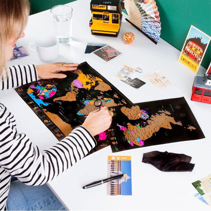 - IN THE BOX. Everything you need to keep your world scratch off map pristine - Scratching pick, mini magnifying glass with 5x magnification & ultra soft microfibre Cleaning Cloth, bundled together in our luxury microfibre kitbag & poster tube