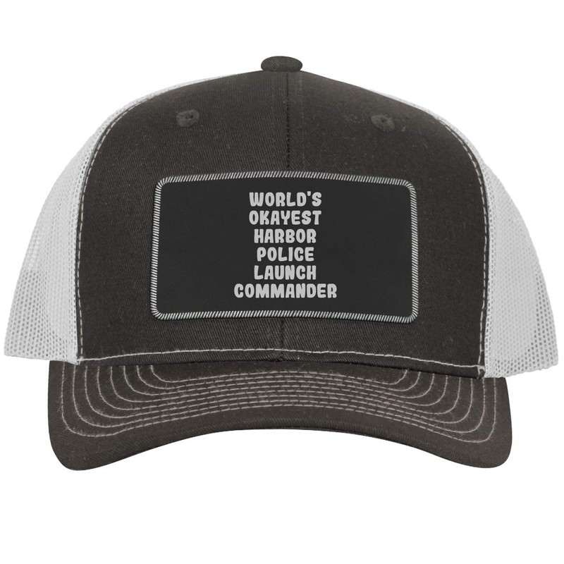 World's Okayest Harbor Police Launch Commander - Leather Black Patch Engraved Trucker Hat, Grey-White, One Size