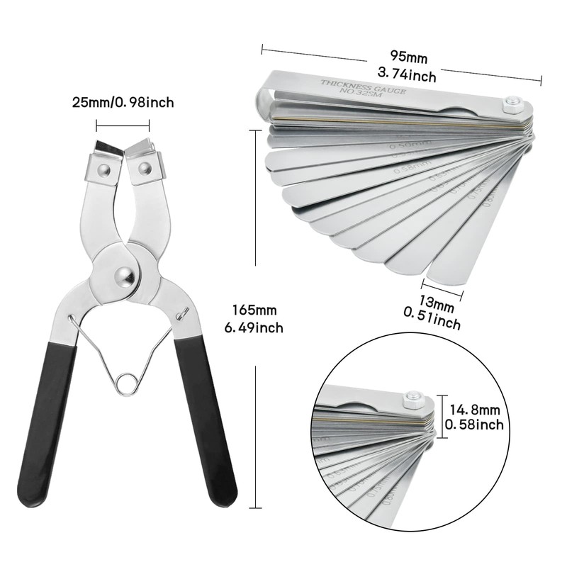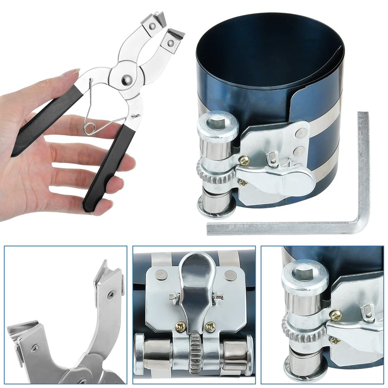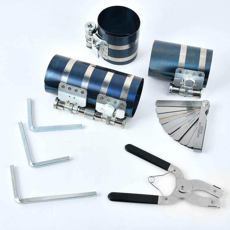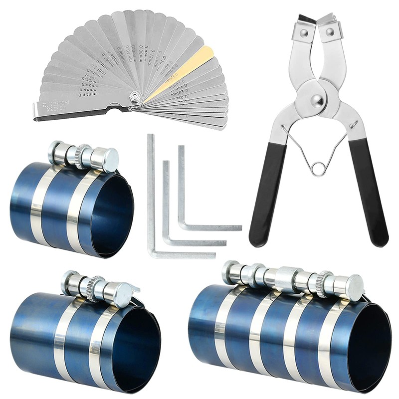 - Value Package: There are 1pcs 3" piston ring compressor, 1pcs 4" piston ring compressor, 1pcs 6" piston ring compressor, 1pcs piston ring pliers, 1pcs feeler gauge and 3pcs hex keys, total 8 pieces. 3 sizes for mechanic's daily engine rebuild.