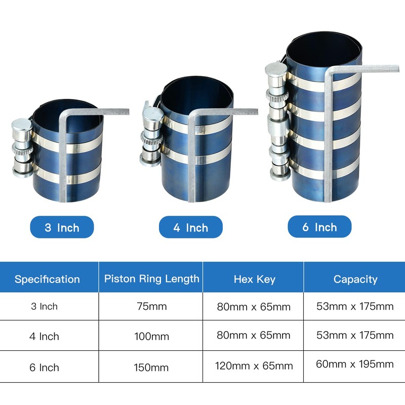 - Adjustable Diameter: 3" 4" 6" piston ring compressor can be freely adjusted to expand the piston ring during disassembly, 3" piston ring compressor adjustable diameter range: 53mm - 175mm; 4" piston ring compressor Adjustable diameter range: 53mm - 175mm; 6" piston ring compressor adjustment diameter range: 60mm - 195mm.