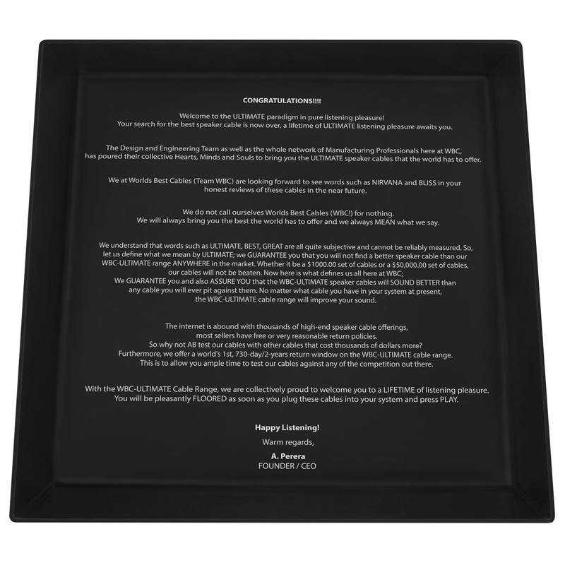 - With the “WBC – Ultimate Assembly Range” of cables, you will experience the best WBC has to offer whilst enjoying the aesthetically pleasing looks these luxury assemblies will bring into your system. The high-end packaging, makes these a great gift for any Audiophile or Music Lover who will appreciate handcrafted, high quality audio cabling. The braided Tweed cloth jacket and embroidered labeling will compliment your high-end gear quite tastefully; this is truly “The Ultimate” speaker cable.