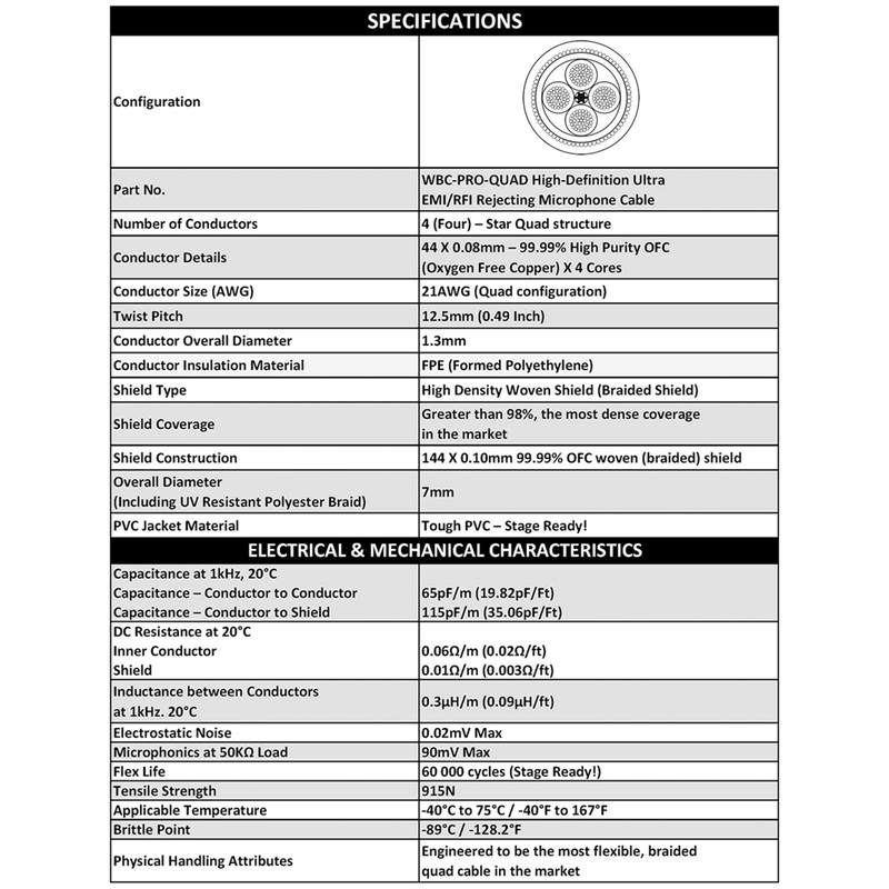 • WBC-PRO-QUAD is truly the Most-Silent & the Most-Flexible Star-Quad cable in the market & boasts a tough UV-protected outer jacket, a dense braided shield (above 98% coverage) & four, 0.08mm Fine-Stranded 99.99% Oxygen Free Copper cores totaling to 21AWG. Excellent shielding coupled with the Star Quad design totally cancels out all EMI & RFI, this stage-ready cable will encounter, resulting in the purest form of signal transmission. Superior to Industry leaders like Mogami 2534 & Canare L-4E6S.