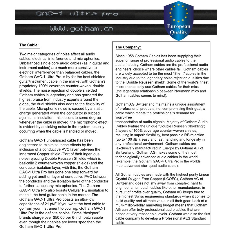 - Gotham AG, headquartered in Dietikon Switzerland, has been supplying their superior range of professional audio cables to the audio-industry since 1958. All Gotham cables are exclusively manufactured in Europe using Linear Crystal Oxygen Free (LCOF) Copper. Widely accepted as the most ‘Silent’ cables in the industry, even used by legendary Neumann microphones. Due to their excellent properties most Audio Engineers choose Gotham cables over other brands.