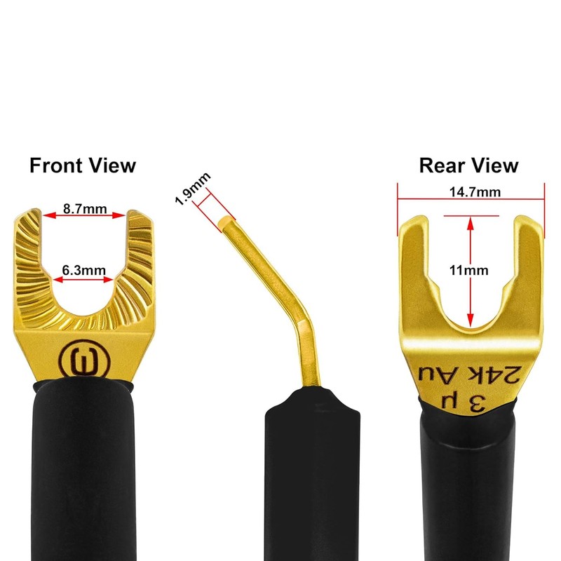 - At WBC we only use the highest-grade connectors for these audiophile cable assemblies. Eminence 3-micron, 24K Gold plated, audiophile-grade, 4mm (standard diameter) banana plugs with a fully insulated body to prevent accidental shorting & multi-spade connectors, (compatible with 8mm and 6mm binding posts), provide superior abrasion & corrosion resistance and unrivaled performance. The banana & spade plugs are specially reinforced to support heavy gauge cables (special shaft & thicker profile).
