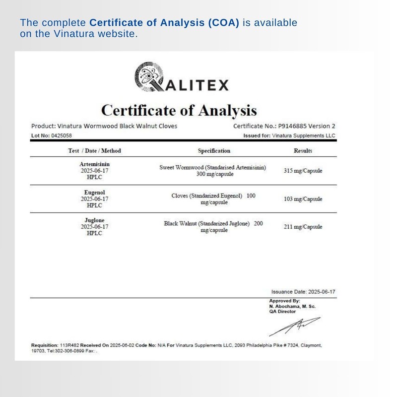 VINATURA Wormwood Black Walnut Clove Capsules - Cleanse, Detox, Intestinal Guard Formula Supplement for Humans, with Wormwood herb, Black Walnut Extract Combination, 60 Capsules