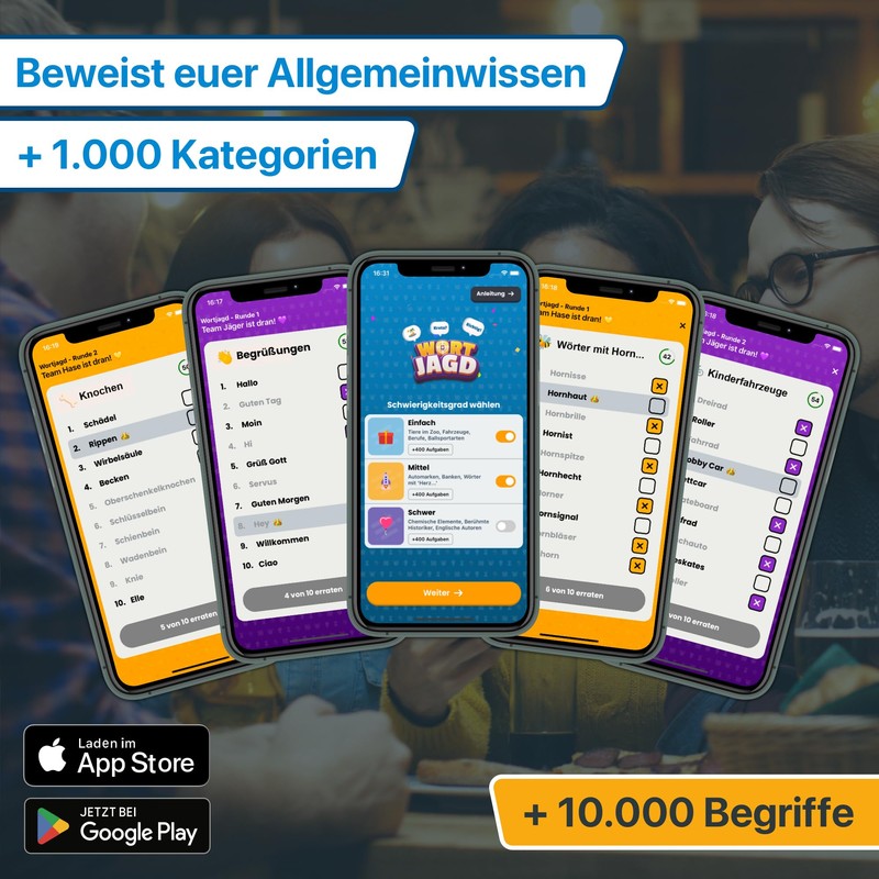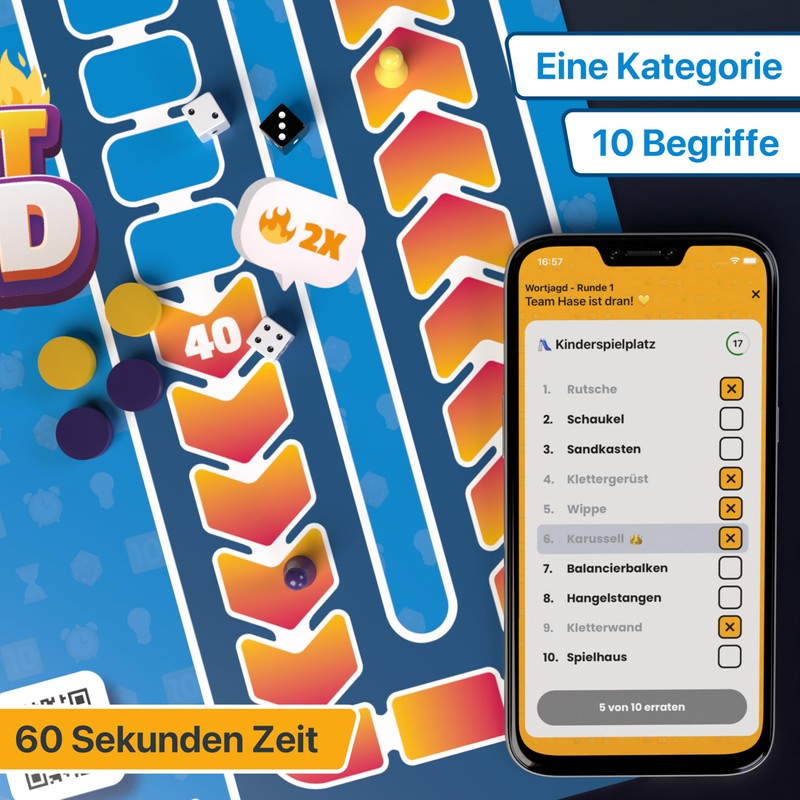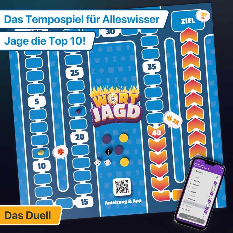 Wortjagd - Chase the Top 10, categories duel - general knowledge quiz for friends and family, board game with app for 2-12 players, party game with tempo