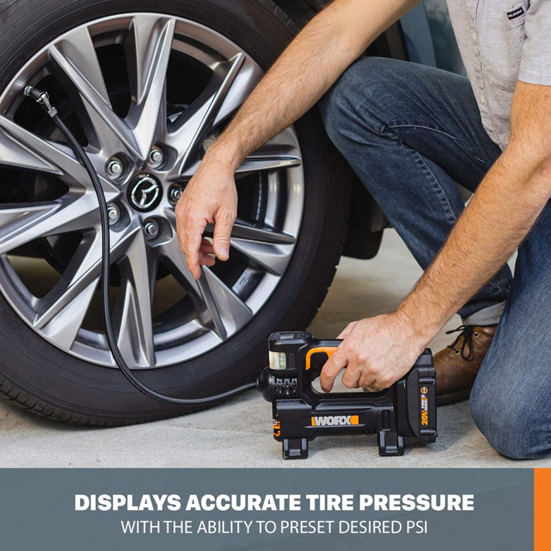 You can inflate all the tires on the car and then some with the Worx 20V Power Share Portable Inflator. It fills up 4.5 tires on one charge. And it goes from 0-36 psi in about 4 minutes per tire. That's faster and more efficient than inflators from other brands. And you don't have to plug it into your car's DC port and then park some place that's convenient to use it. Take it to the pool, the dock, even pack it for a long bike ride, it's the ultimate in portability and convenience. The LED lamp outputs 100-200 Lumens and can be used as a work light so you can see what you're doing, a flashlight if you need to take a walk in the dark to a service station, even an emergency beacon to alert other motorists that you need assistance. The flexible 3-foot hose lets you reach nozzles and stems that are hard to get at, and it comes with 3 adaptors: 1 sports ball needle, 1 Presta and bike valve adaptor, 1 tapered adaptor for small inflatables like pool toys. Plus, the soft-grip handle is comfortable to hold and use for long stretches. Keep the Worx 20V Power Share Portable Inflator in your trunk and gain the peace of mind you get from being prepared. This model does not include a Worx Power Share battery or charger.