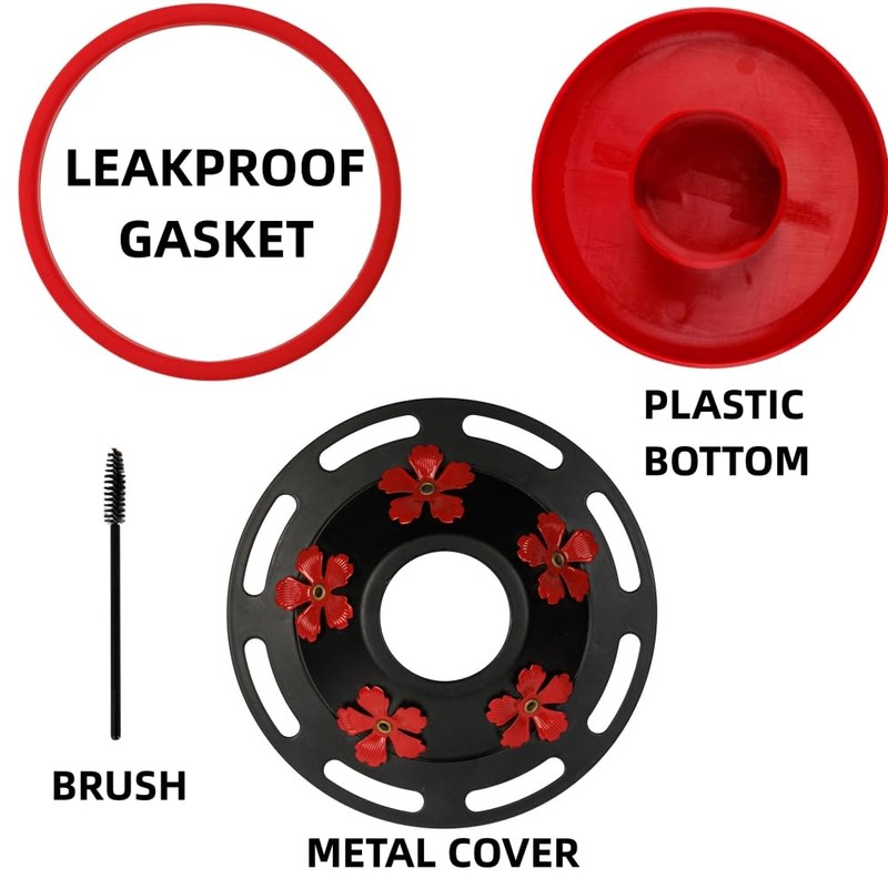 - THE BASE INCLUDING: A metal cover with red metal flower, hummingbird perches and feeding ports; A leakproof gasket, a red plastic bottom and 1 brush