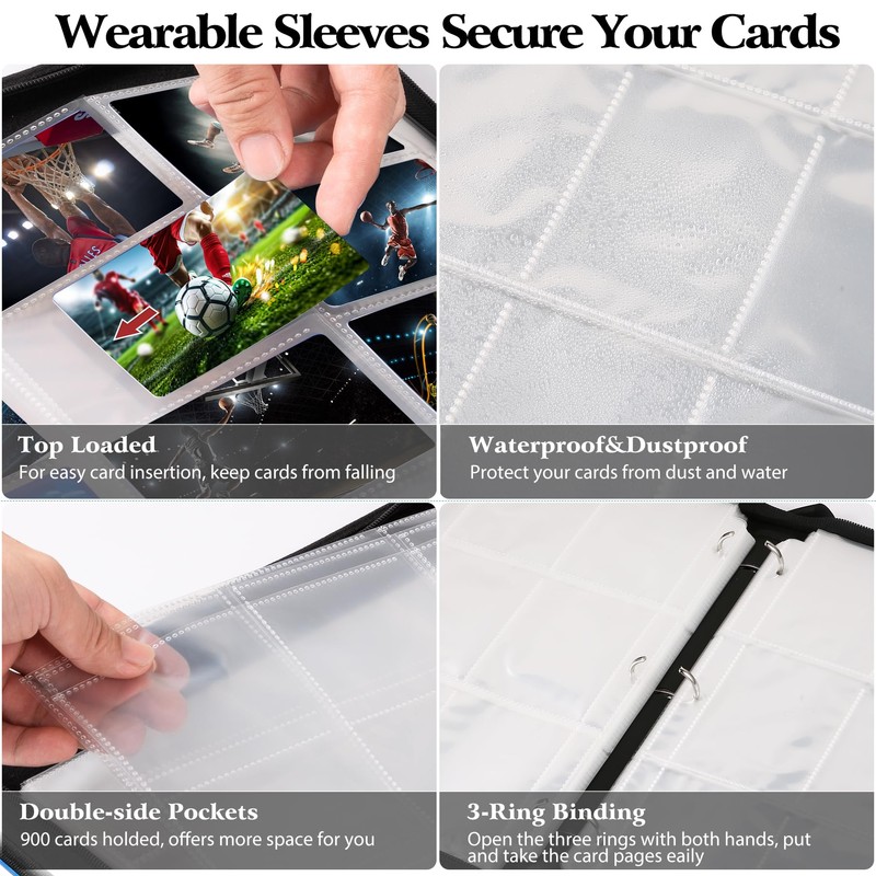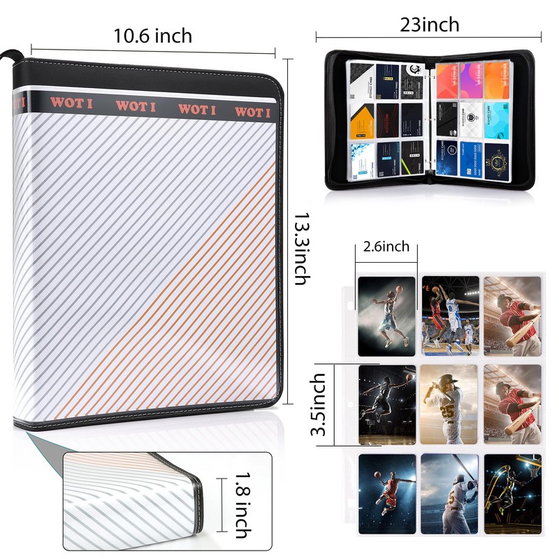 • 【900 Pockets Storage Space】 WOT I 9-pocket card binder comes with 900 card pockets, including 50 removable card sleeves(double-side pocket). it will hold and protect more of your valuable and cherished cards. With size of 3.6x2.7in, each pocket hold up to 2 1/2 x 3 1/2 cards and other standard cards, ensures your favorite cards securely stored and neatly organized.