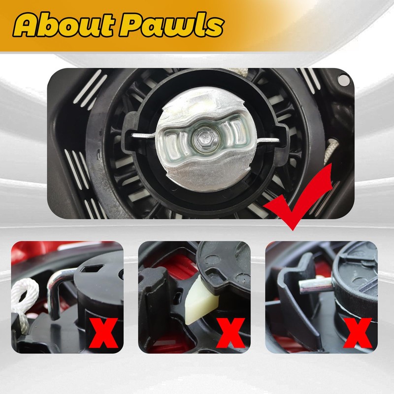 - 【Package】1×Recoil Pull starter, 1×Pull Rope (145cm) and 3×Screw Bolts. (Note: Applies only to devices with 3 screw holes. Please check the pawl and rachet type, nut hole positions and product sizes)