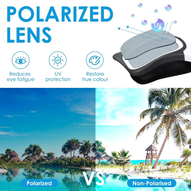 - Polarized and UV Protective Lenses --- These swimming goggles use anti polarization and anti UV lenses, which filter out irregular light, avoid glare and protect your eyes from harmful UV rays. You can see more clearly when wearing the goggles, providing you with noticeable stereoscopic vision. And you can explore the underwater world to your heart's content, ideal for outdoor swimming, outdoor pool swimming, surfing and other open water related sports.
