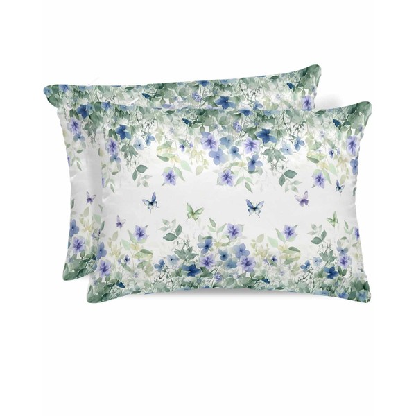Wotrend Plant Standard Pillowcase Set of 2, Green Leaves Flowers Butterfly Satin Pillow Case Cover with Smooth Hidden Zipper Closure, Soft Throw Covers for Couch Sofa Home Decoration 20 X 26 Inches