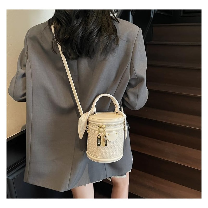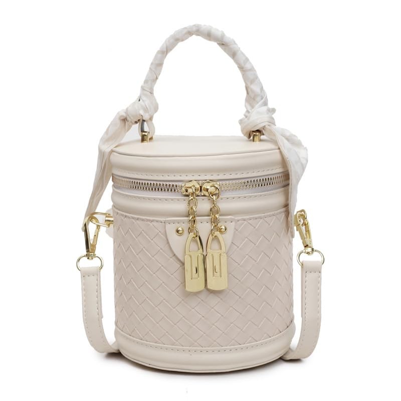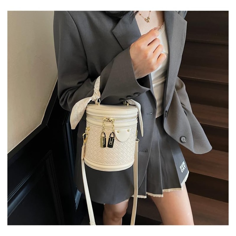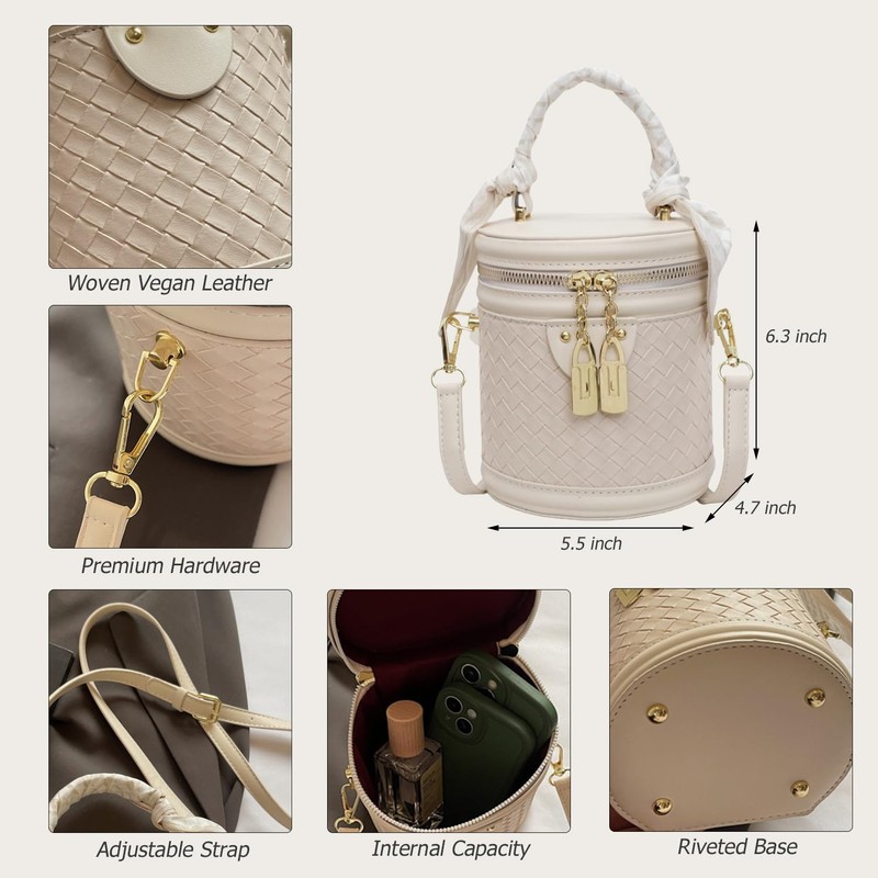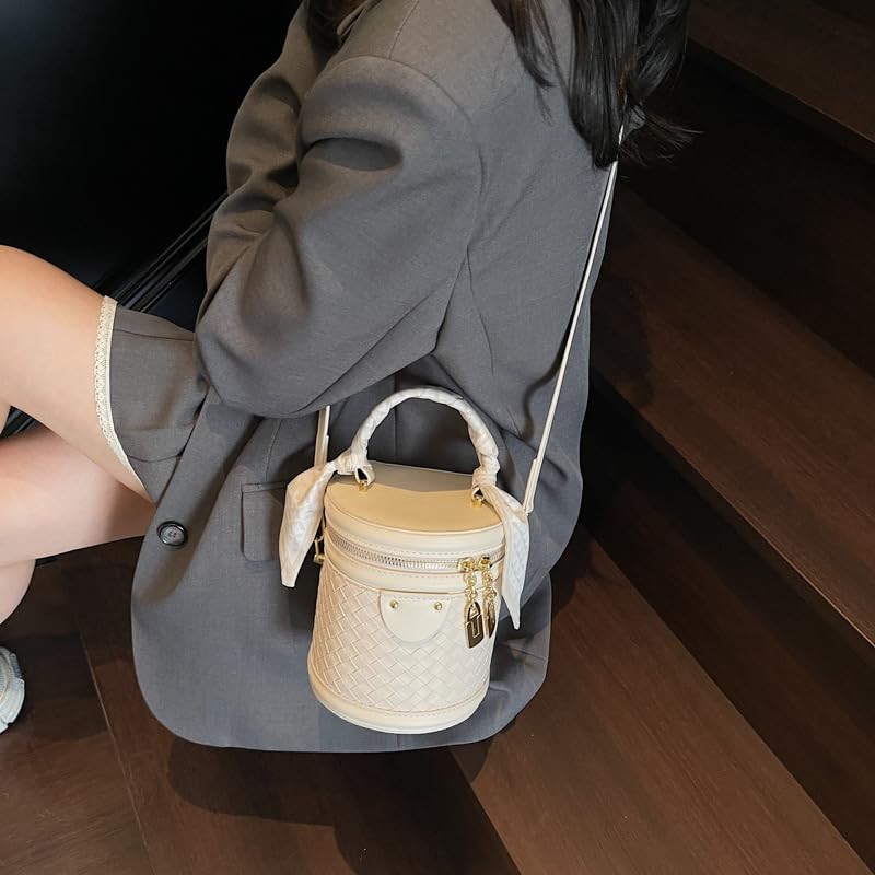 Woven Crossbody Bags for Women Weave Bucket Cylinder Purses Small Shoulder Vegan Leather Mini Top Handle Handbag, White