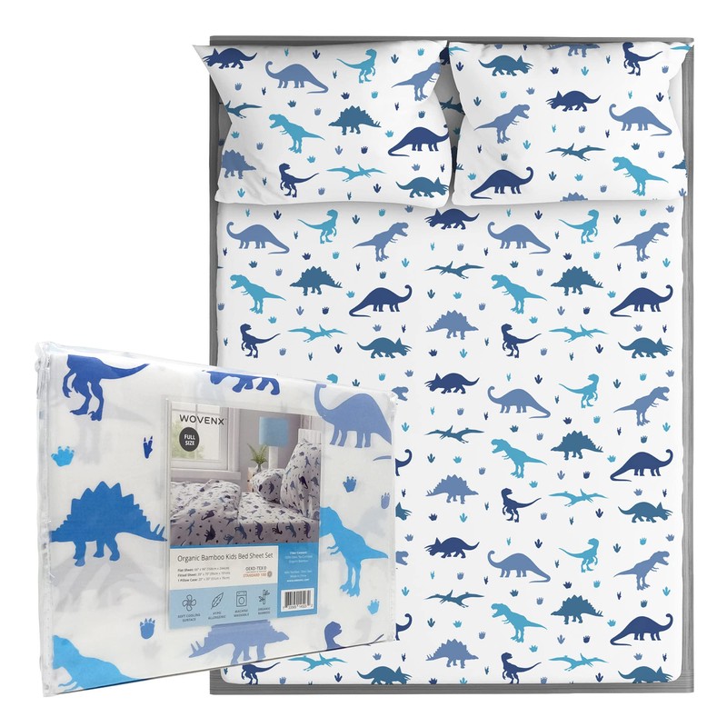 wovenx Kids Organic Viscose Derived from Bamboo Sheet Set | Twin or Full Size Fitted Bed Sheets | Oeko-Tex Certified | Cute Toddler Bedding for Girls & Boys Dino Full