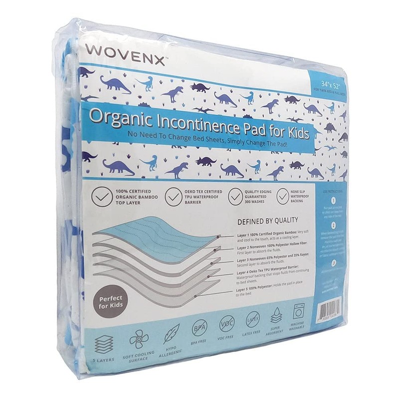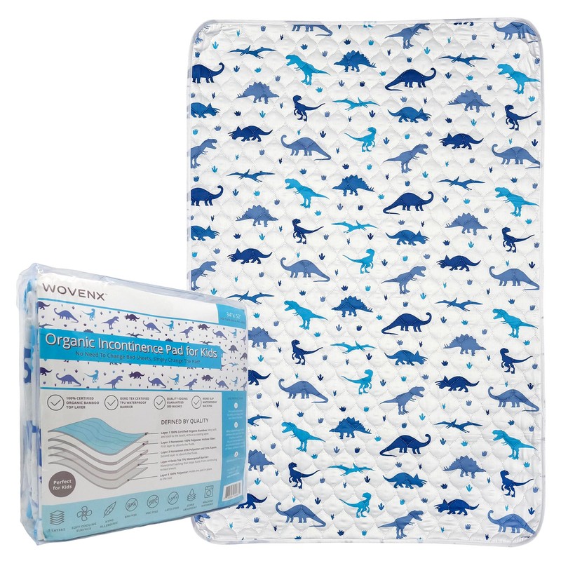 WOVENX Organic Incontinence Pads for Kids & Toddlers - 5 Layer Waterproof Protectors for Overnight Bed Wetting - Reusable & Washable Pee Pads - Fits Twin to Full Size Beds - 34" x 52" Dinosaur