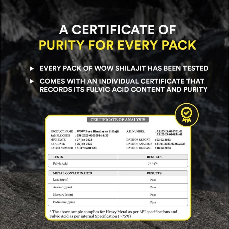 - LAB TESTED FOR PURITY: WOW Life Science Pure Himalayan Shilajit comes with an exclusive lab-tested certificate of purity with every purchase. It is GMP certified and contains 80+ trace minerals like Potassium, Calcium, Iron, Silica & more.