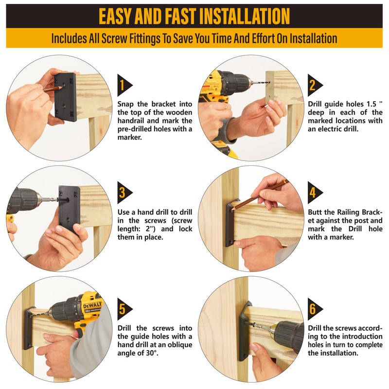 - EASY INSTALL: 1. Snap the Deck Railing Bracket into the top of the horizontal handrail, drill pilot holes with hand drills and lock in place with screws (the ends of the posts may need to be sanded/trimmed due to deviations in external dimensions depending on the type and dryness of the wood); 2. Align the horizontal handrail with the pre-installed position of the post, drill pilot holes with hand drills (Drilled/30°) and lock in place with screws to complete the installation