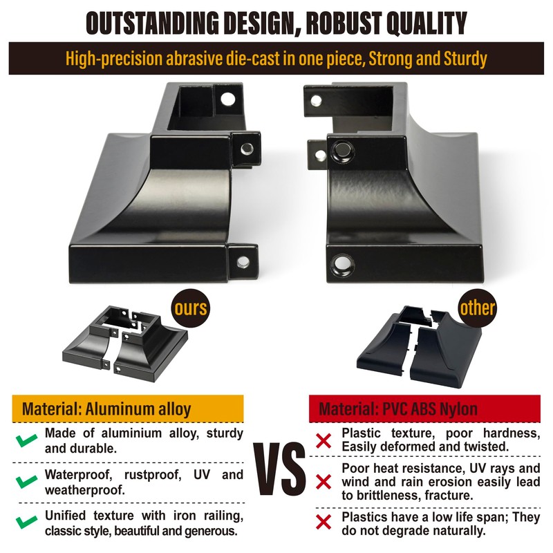 - HIGH QUALITY MATERIAL: Deck Post Base Cover is made of ADC-12 aluminium alloy one-piece die-casting, The surface is powder coating process, Waterproof and UV resistant; Compared with cheap products made of plastic, iron and other materials, Our products will not be deformed, Rusted or Cracked by rain or high temperature, in terms of service life and safety, Our Post Cover Skirt are the most valuable choice.