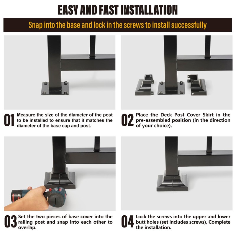- SIMPLE INSTALLATION: Post Base Cover using the pair of card split design, Just two ends of the splicing card, And then screws were locked into the fixed, You can complete the installation (Post fittings will be due to the production or painting will be biased, The use of ABS glue coated in the joints, Can be better fixed to prevent shifting).