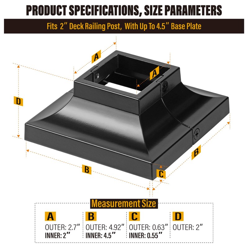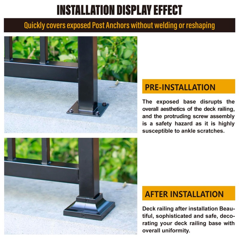 - EXCELLENT DESIGN: Deck post covers features a split design that can easily update your post footing without welding or remoulding, Covering exposed post anchors and post construction defects, Giving your railings, Entry iron handrails a neat, Attractive look.