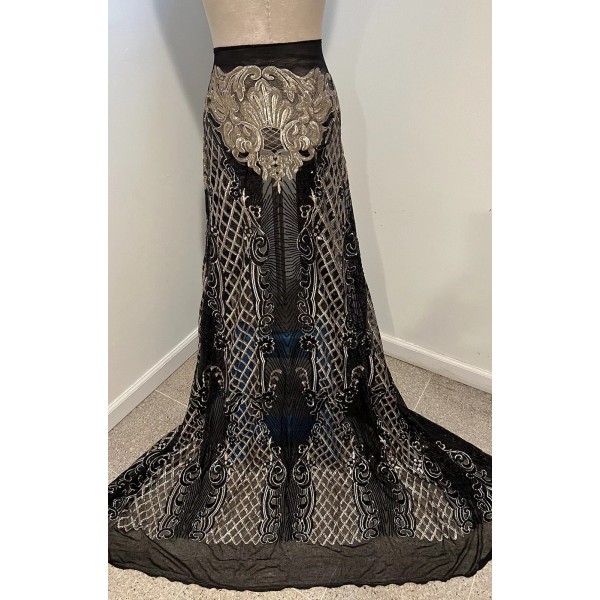 Add a touch of elegance to your next sewing project with this stunning Black Gold Embroidery Lace fabric. The fabric features beautiful floral patterns made of sequins that will give your dress, costume or bridal gown a glamorous look. It is made of synthetic fiber content and has a medium weight suitable for apparel, crafts, and special occasions.