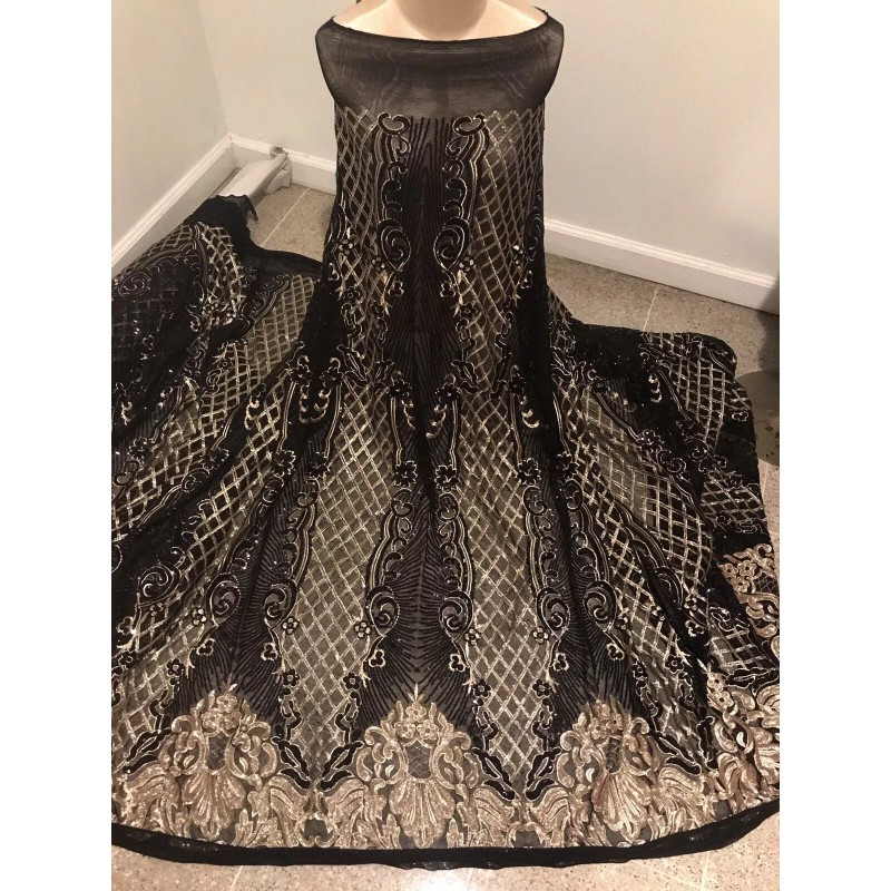 wowfabric4less123 Black Gold Embroidery 4way stretch sequin Lace fabric 50” Width 1 Yard
