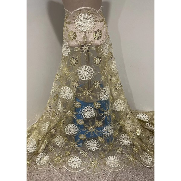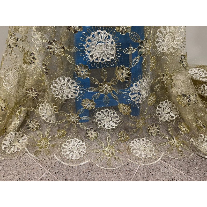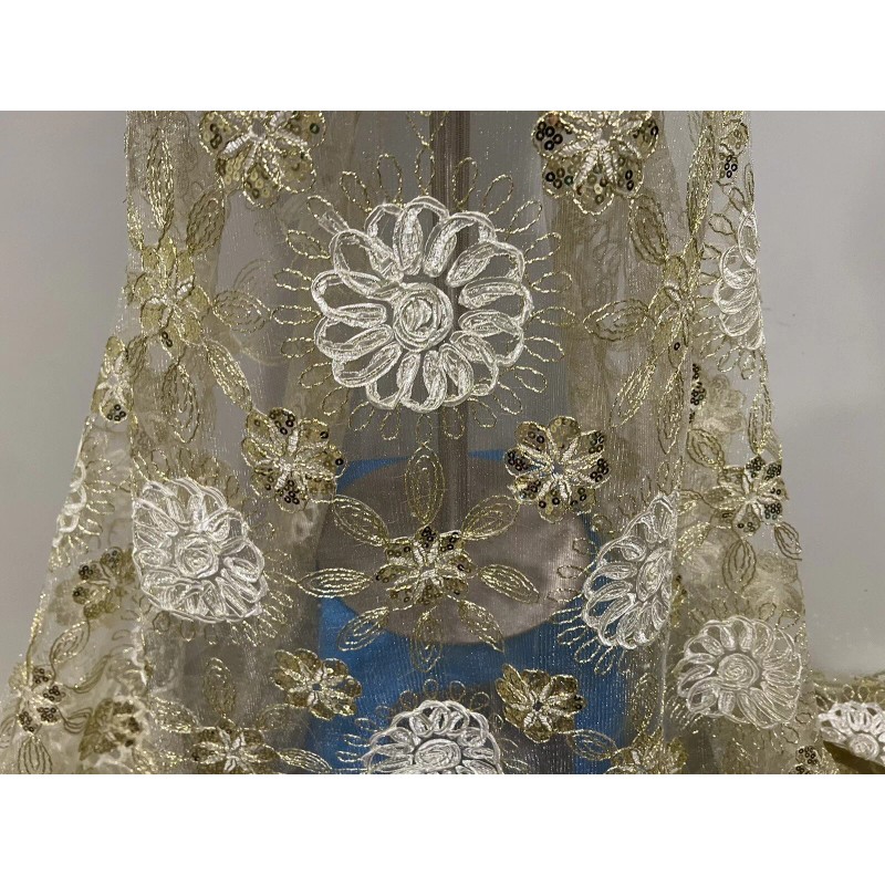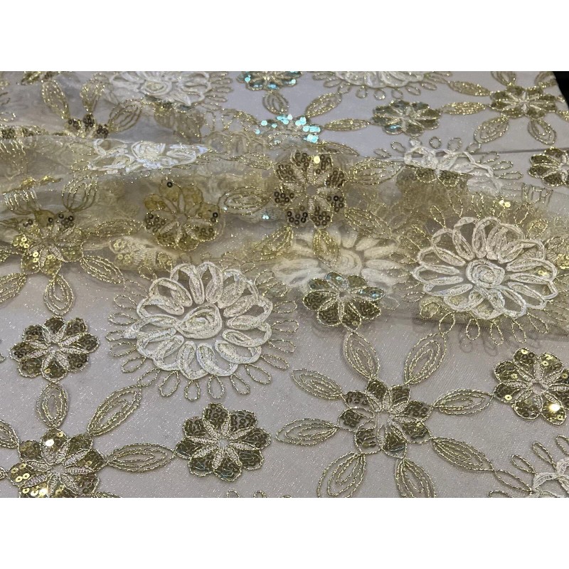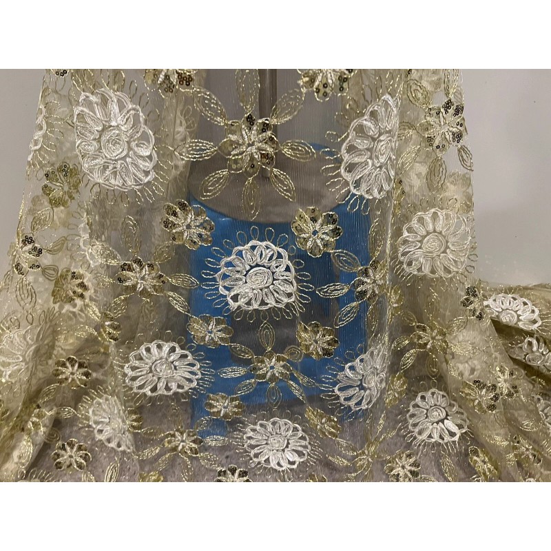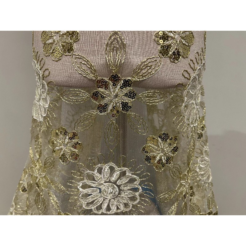 This beautiful lace fabric features stunning ivory gold floral patterns with intricate sequins and embroidery. It measures 50 inches in width and is sold by the yard. The medium-weight mesh/net material is made from synthetic fiber content, making it suitable for various applications such as apparel, accessories, crafts, and even wedding decor.