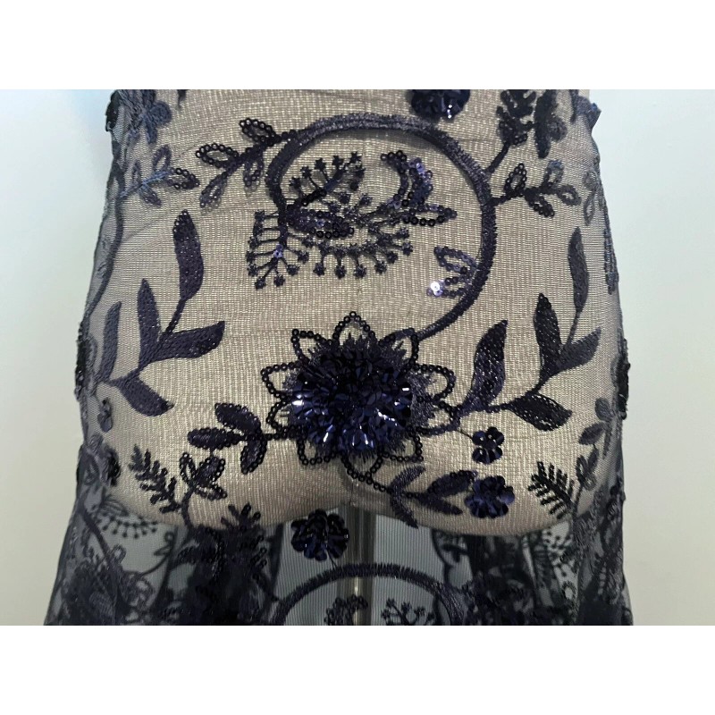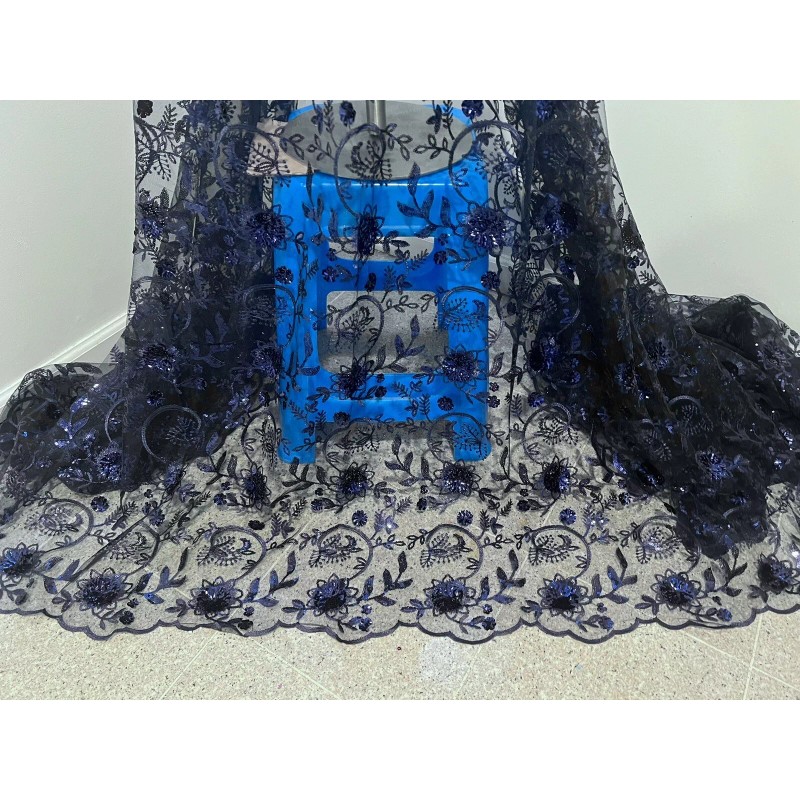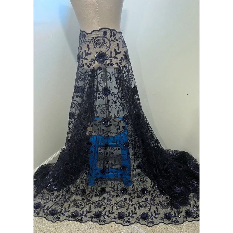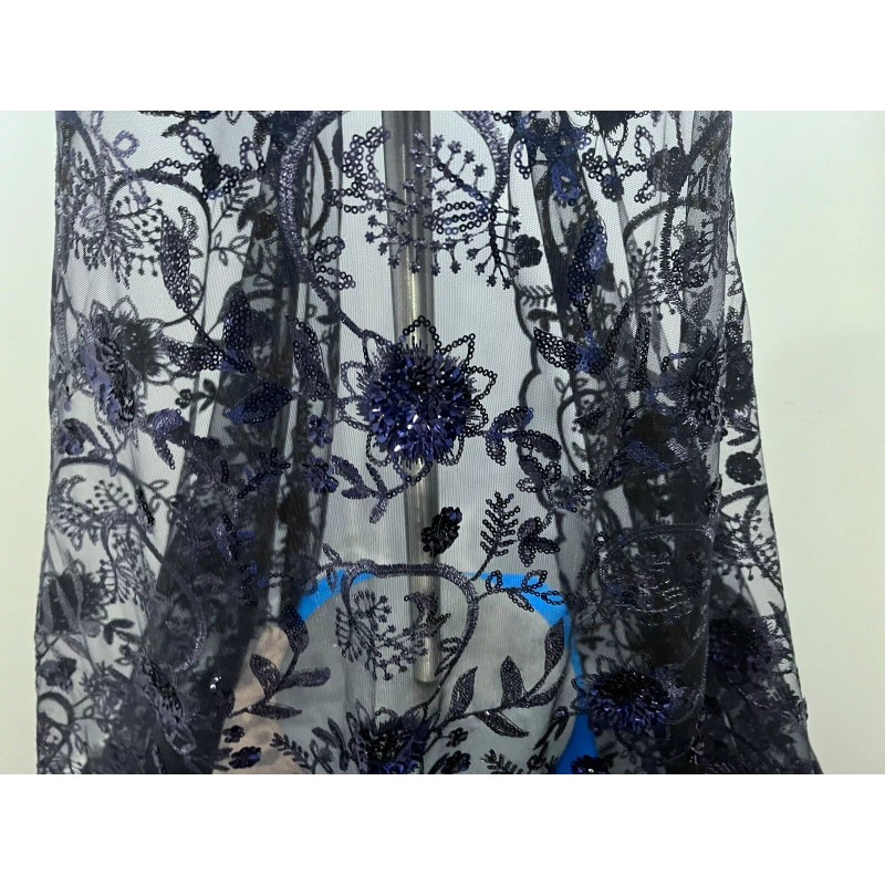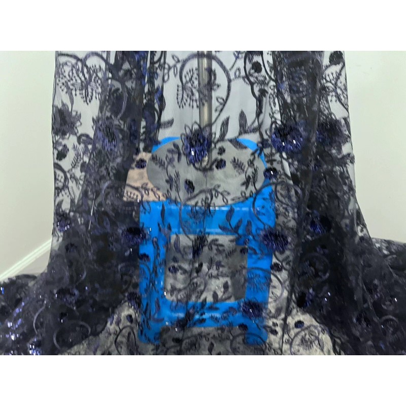 Indulge in the charm of navy blue with this lace fabric from Wowfabric4less123. The delicate floral pattern is accentuated with intricate embroidery and shimmering sequins. The medium-weight synthetic mesh/net material is perfect for crafting apparel, accessories, table tops, cushions, hats, costumes, and more.