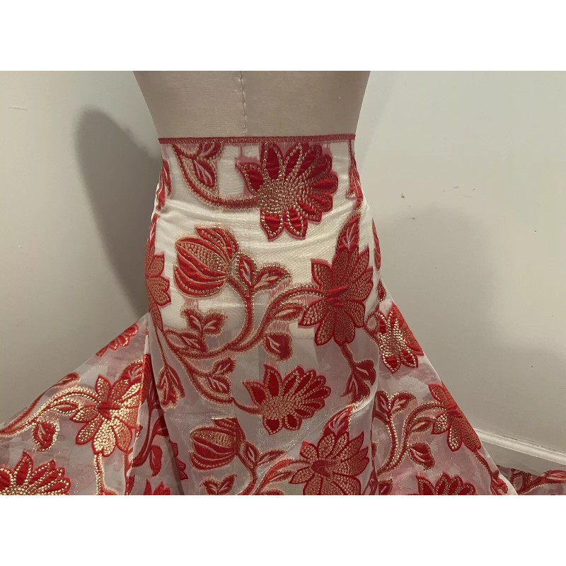 Add a touch of elegance and luxury with this beautiful RED GOLD WHITE Metallic Brocade ORGANZA Fabric. The fabric is perfect for a variety of projects, including apparel, table tops, curtains, costumes, and crafts. The floral pattern and metallic accents create a stunning and unique design that will surely catch everyone's attention.
